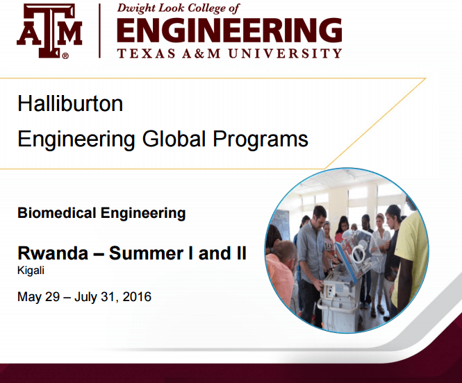 Making a World of Difference The Department of Biomedical Engineering at Texas A&M University is partnering with Engineering World Health to offer undergraduate engineering students the opportunity to participate in an intense and challenging study abroad program in the Republic of Rwanda through which they will help develop medical devices and technologies that address critical needs, as well as provide desperately needed medical equipment repair services. Through the program, students immerse themselves in the region’s language and culture while learning practical, hands-on engineering skills. Students also learn medical device design and have opportunities to use their experience to define their own design projects. As part of the program, students collaborate with the medical facility staff to increase their knowledge base as well as that of the hospital staff.